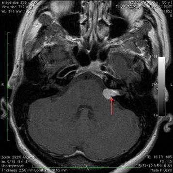 As the acoustic neuroma grows it compresses the hearing and balance nerves usually causing unilateral one sided hearing loss tinnitus ringing in the ear and dizziness or loss of balance. The most common presenting symptoms are unilateral sensorineural hearing loss tinnitus and imbalance. It grows slowly from an overproduction of schwann cells and is also called a vestibular schwannoma. Acoustic neuroma is a rare noncancerous tumor.