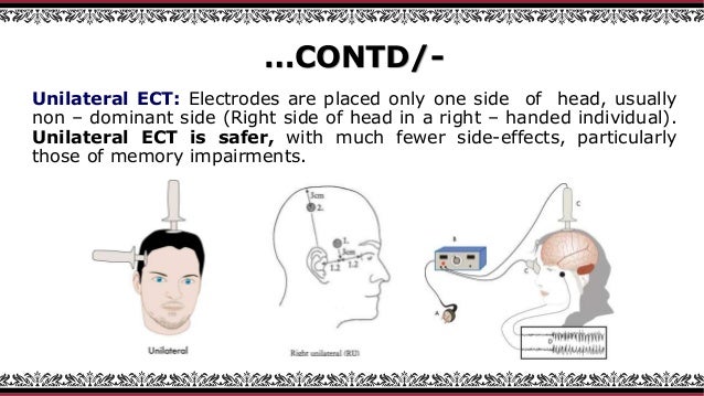 Most patients do not report that ect is a subjectively stressful experience. Ultra brief pulse which is given unilateral can be tried first as it has minimal cognitive side effects. Bilateral ect markedly impaired delayed retention of verbal and nonverbal material. In bilateral ect electrodes are placed on either side of your head.