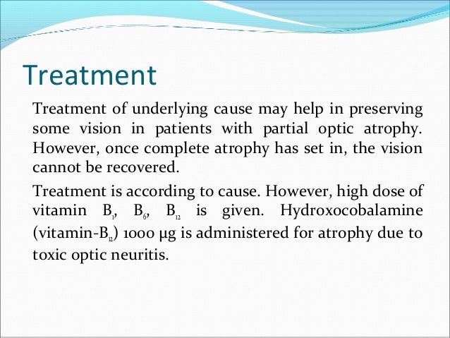 Affected patients should be under joint neurological and ophthalmological care. However treatment that is initiated before the development of optic atrophy can be helpful in saving useful vision. The most common is poor blood flow. Find a doctor or location.