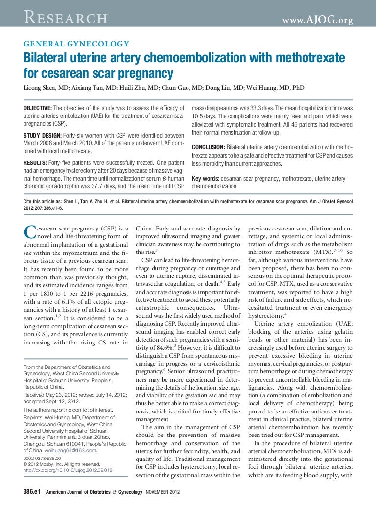 Bilateral Uterine Artery Chemoembolization With Methotrexate For Cesarean Scar Pregnancy