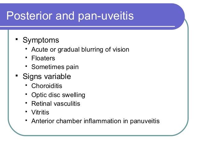 Posterior uveitis treatment. Surgery to remove some of the vitreous in your eye is rarely used to diagnose or manage the condition. Surgical or other procedures vitrectomy. In posterior uveitis the. In intermediate uveitis eye drops may well be able to reach the area of inflammation and sometimes injections.