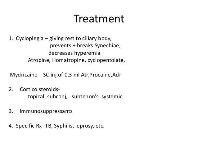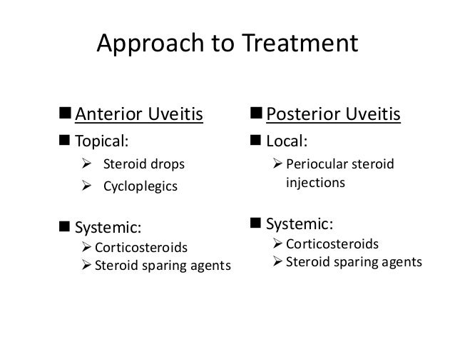 Since uveitis can be idiopathic or associated with many serious disease entities the proper treatment approach is very nuanced has to be tailored to the patient and may continue for years. Uveitis related complications also warrant specific therapeutic approaches. However long term use of systemic corticosteroids carries with it the risk of increased pressure in the eye glaucoma and cataracts so the patient must be followed closely. Treatment strategies for uveitis will depend on the anatomic location of inflammation i e anterior vs intermediate vs posterior vs panuveitis clinical disease severity disease duration and likely etiology.