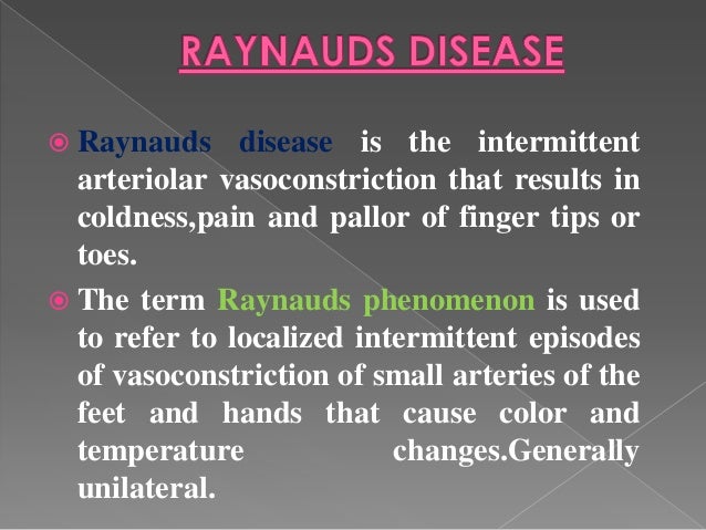 Unilateral raynaud s phenomenon is much less common and always secondary to local or regional vascular disease. Raynaud disease and related raynaud s phenomenon is the tendency of cold temperatures to trigger spasms in the arteries of the arms and legs which causes skin discoloration and discomfort usually in the hands and feet. Multiple sclerosis ms a chronic inflammatory disorder of the cns presents with a diverse range of neurological symptoms and signs. The symptoms of raynaud disease are usually brought on by exposure to cold air temperature or by touching something icy.